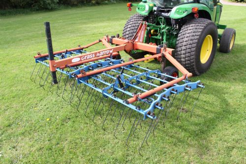 This grass harrow has a 3000mm working width, configured in two 1500mm sections with 48 tines per section. It has a transport width of 2500mm and height of 1450mm, with hydraulic folding. This machine weighs 260kg, is used, and is in excellent condition.