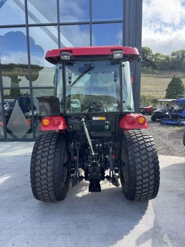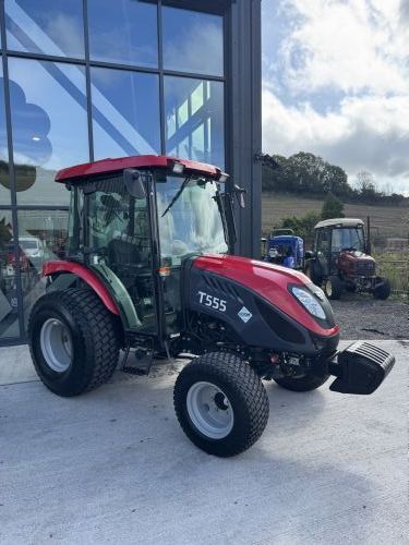 TYM T555 Tractor with 55hp 4-cylinder Yanmar diesel engine. 12-Forward/12-Reverse shuttle transmission, 2-speed PTO with headland management. 2x Double acting spool valves, 1500kg lift capacity, full cab with air conditioning. Turf tyres & front weights