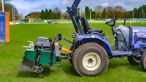 The machine has been designed to confine the soil cores within the swath for collection with Groundsman’s patented Flexblade Core Collector attachment. Core and collect in one pass. This amazing attachment has a series of plates like shovels linked together to follow the grass surface contours gathering 60% of the soil cores before they land on the ground and the rest are scooped cleanly off the surface. The cores are tipped in a pile when the machine is raised on the apron. This implement can then draw the row of core pile into one collective pile leaving the surface ready for top dressing and keeping it in play.