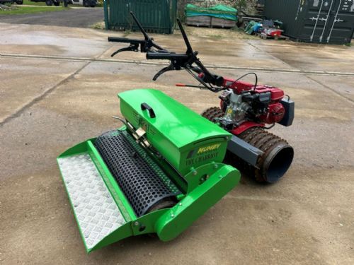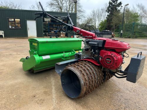 MUMBY CHARRIOT SEEDER MCS910 with Honda F560 Power Unit - good condition - 91cm roll width - front and rear cast ring rollers - seed hopper capacity 20kg - stainless steel seeding system - seed chute fitted with bottom flexi belt - adjustable seed rates 3-40gms per sq. metre - rear fold down footplate - rear cast ring roller fitted with scraper kit - calibration tray - Fitted to Honda F560 Power Unit - 5.5hp petrol engine - 6 forward and 2 reverse gears - steering clutches - front counterbalance weight and frame - good condition